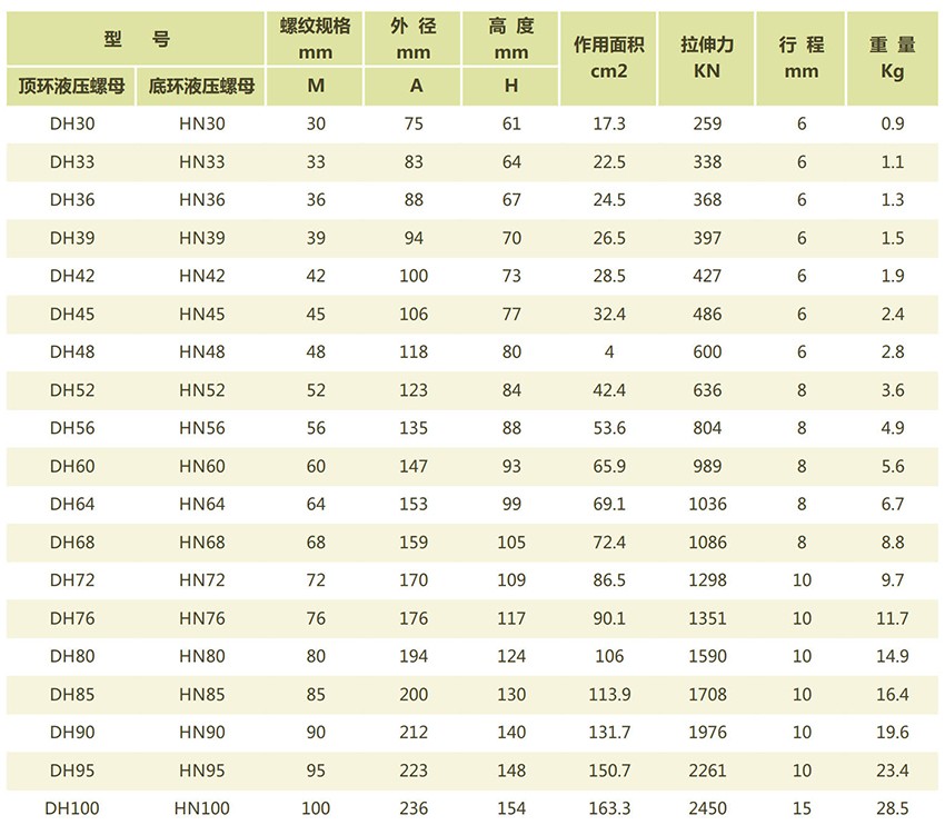 DH液壓螺栓拉伸器選型表