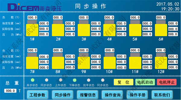 同步頂升系統(tǒng),其核心電氣控制系統(tǒng),是由德國(guó)西門(mén)子PLC可編程控制器組成,通過(guò)高性能控制器檢測(cè)位移以及壓力數(shù)據(jù),根據(jù)傳送控制指令,驅(qū)動(dòng)閥組的開(kāi)合頻率,使液壓千斤頂進(jìn)行工作。實(shí)時(shí)的壓力信息和位移閉環(huán)數(shù)據(jù)高速傳輸反饋給電腦控制系統(tǒng),從而精準(zhǔn)控制各液壓千斤頂在升降時(shí)的動(dòng)作負(fù)載均衡。